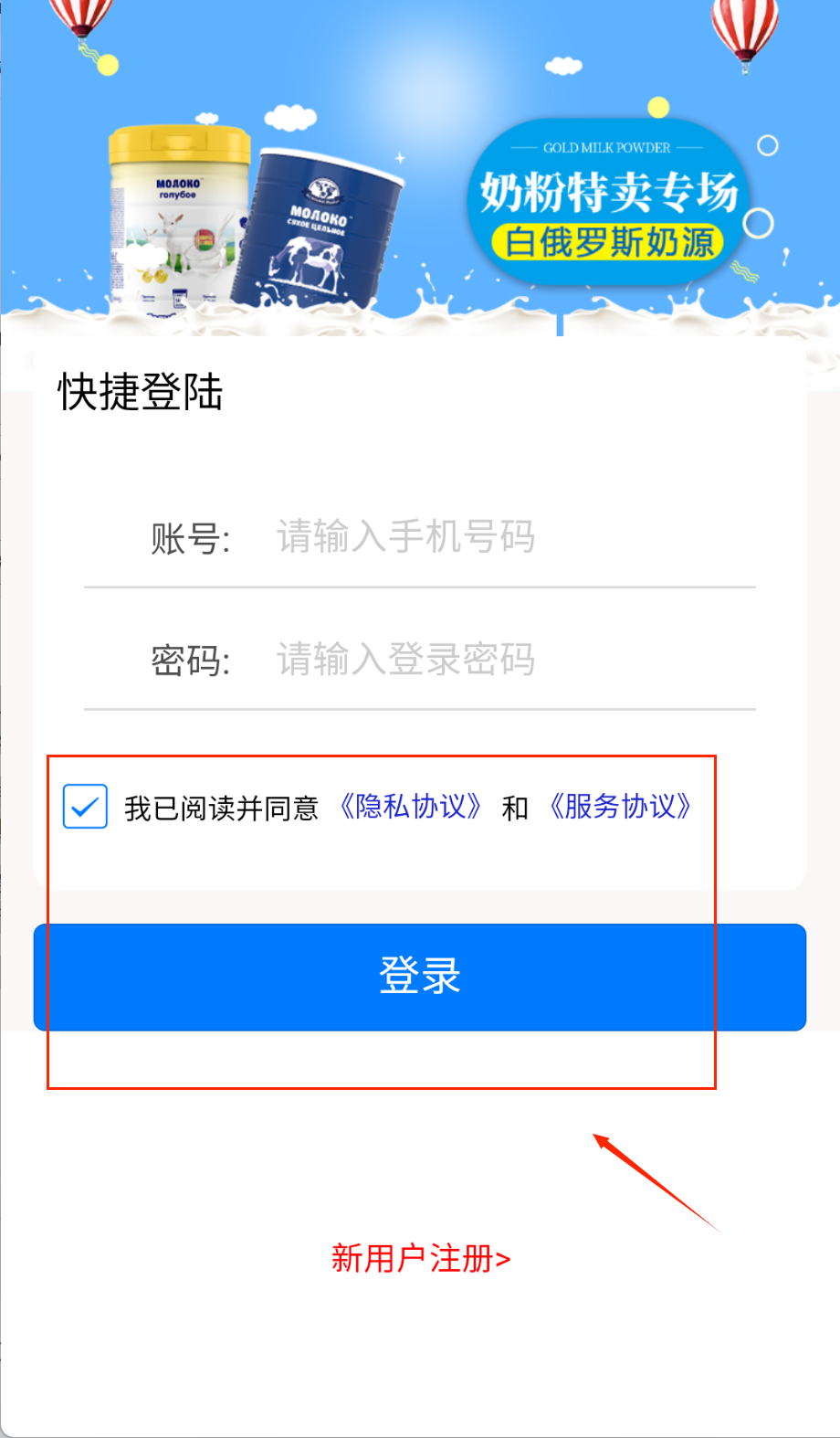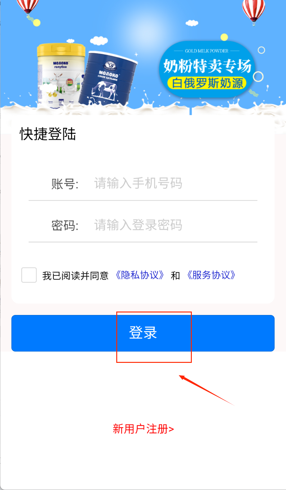 2、登录界面能看到醒目的奶粉特卖宣传图呢,输入注册时用的手机号和密码后,勾选协议同意框,点击蓝色登录按钮就能进入主界面。