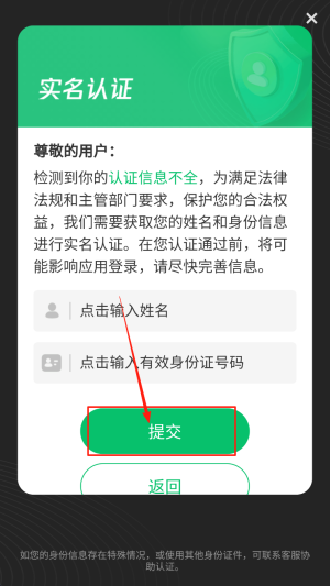 3、进入“实名认证”页面,依次输入姓名与身份证号,点击“提交”完成实名认证。