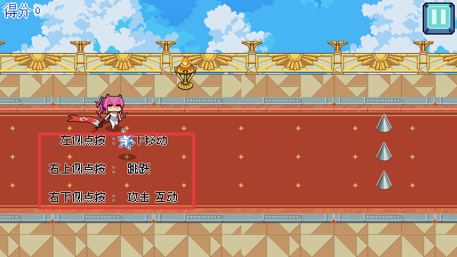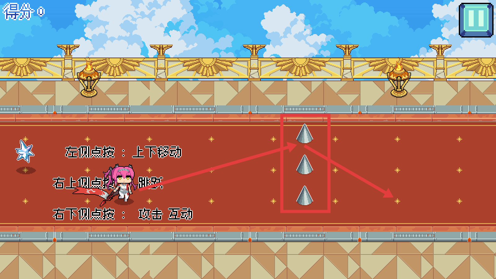 2、遇右侧【尖刺障碍】,结合移动+跳跃,规避伤害(如三连尖刺处,提前起跳)。