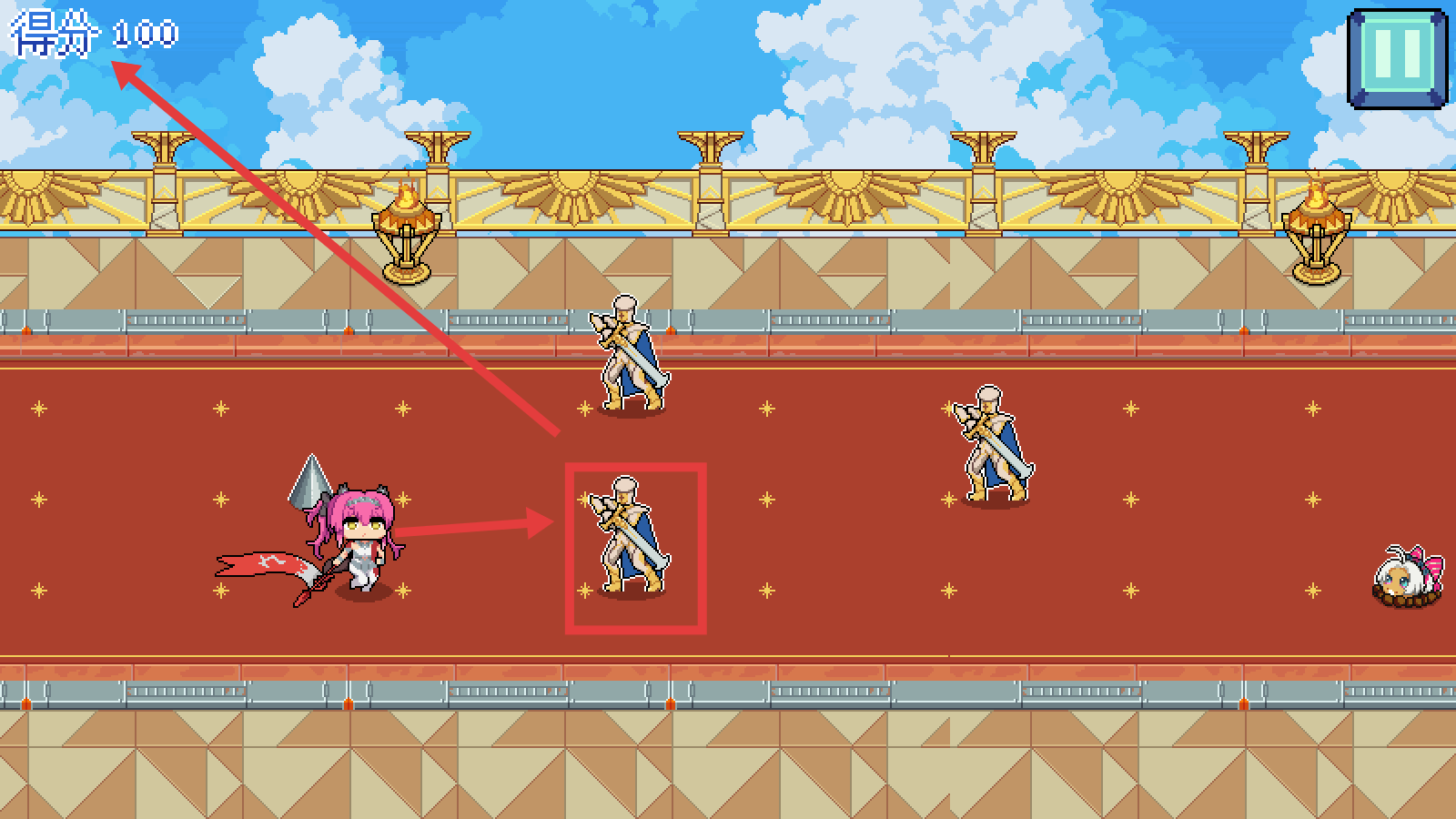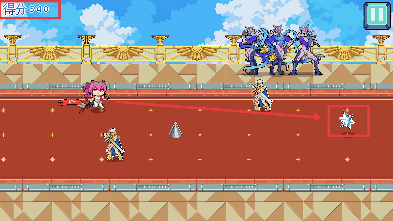 3、击败【金色盔甲敌人】,每击杀提升得分(如0→100→540),积累闯关进度。