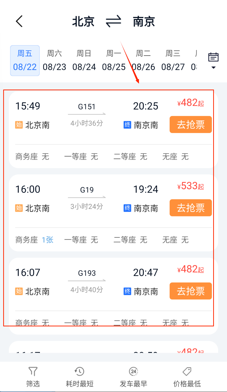 2、在查询结果页面可查看不同车次或航班的详细信息,包括出发时间、票价余票和行程时长等。支持按价格、时间等条件筛选排序。
