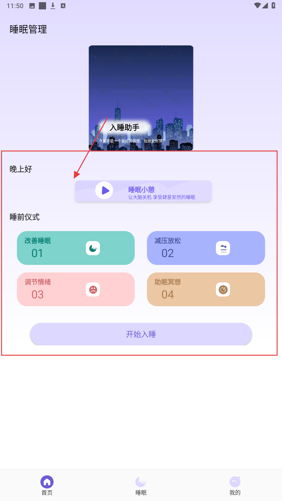 1、进入睡眠管理,点【睡眠小憩】或选睡前仪式(如改善睡眠)开启助眠。