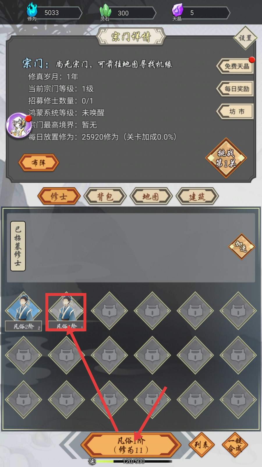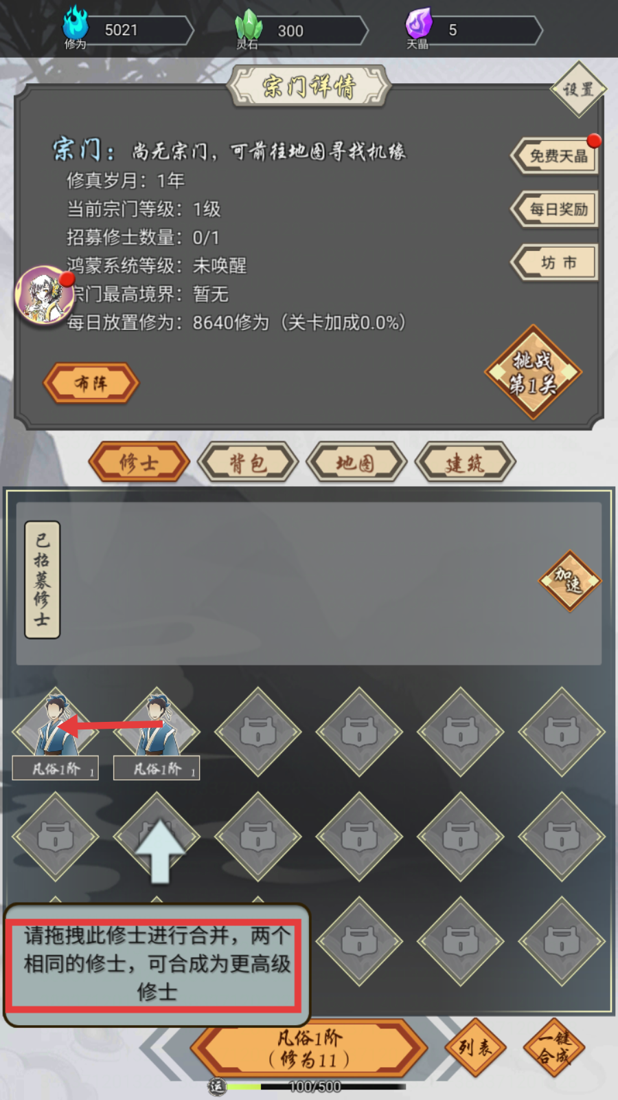 3、拖拽两个【凡俗1阶】修士合并,遵循合成规则,解锁更高阶修士突破养成瓶颈。