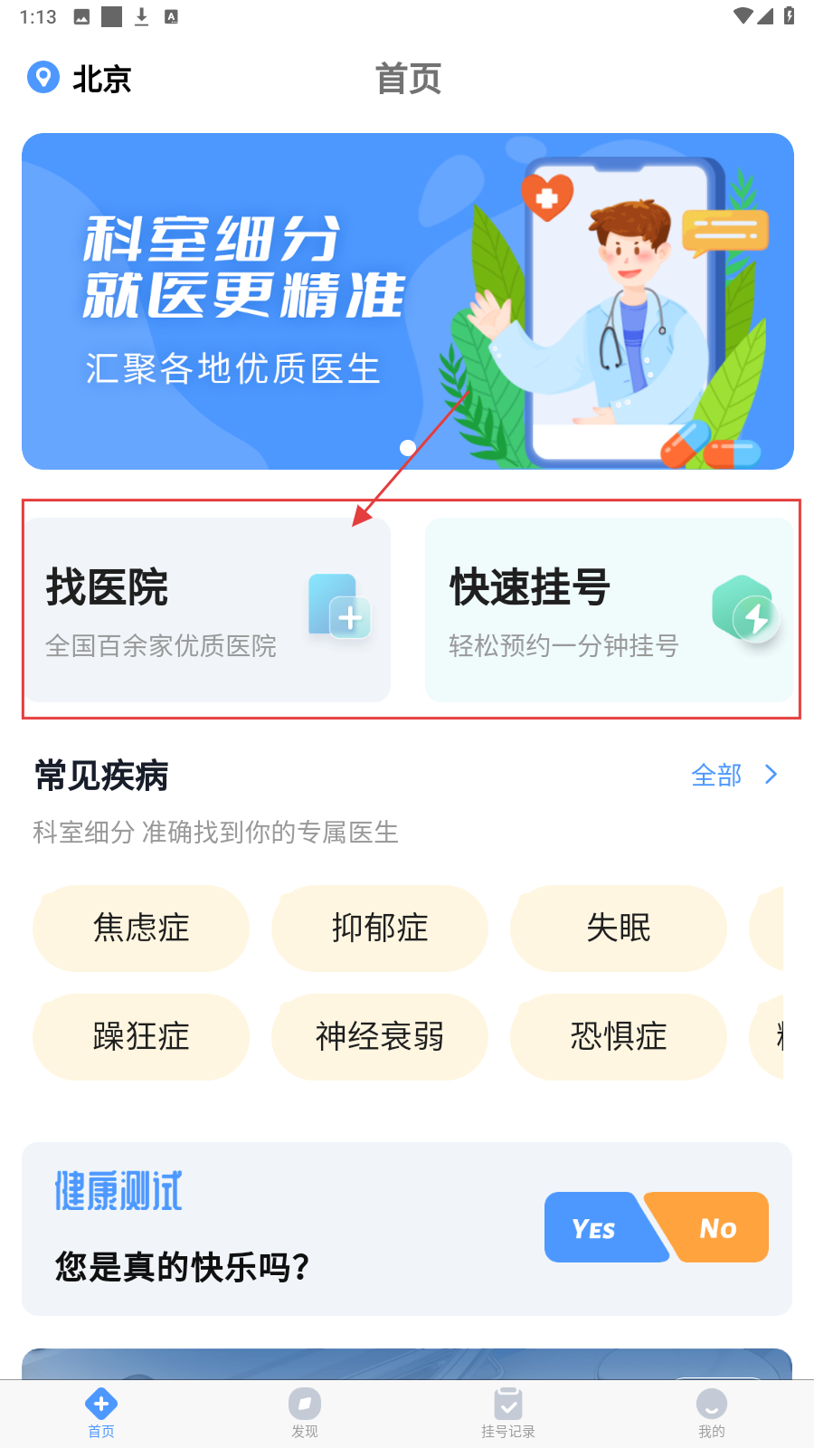 1、进入应用首页,点【找医院】选目标医院,开启就医流程。