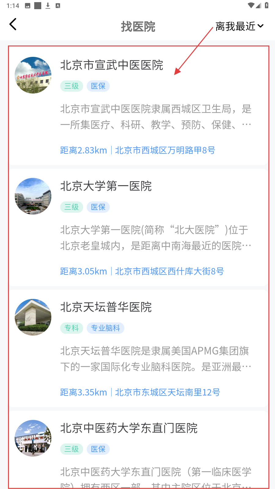 2、在【找医院】结果页,选北京市宣武中医医院等,查看医院详情。