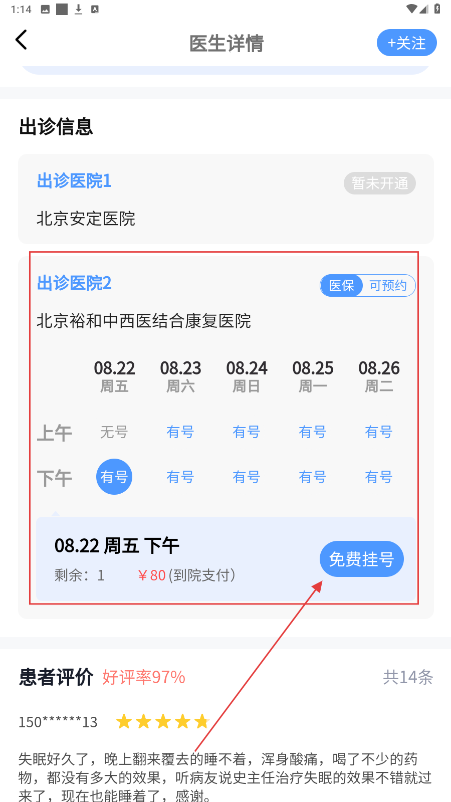 4、医生详情页查出诊信息(如北京裕和医院排班),点【免费挂号】。