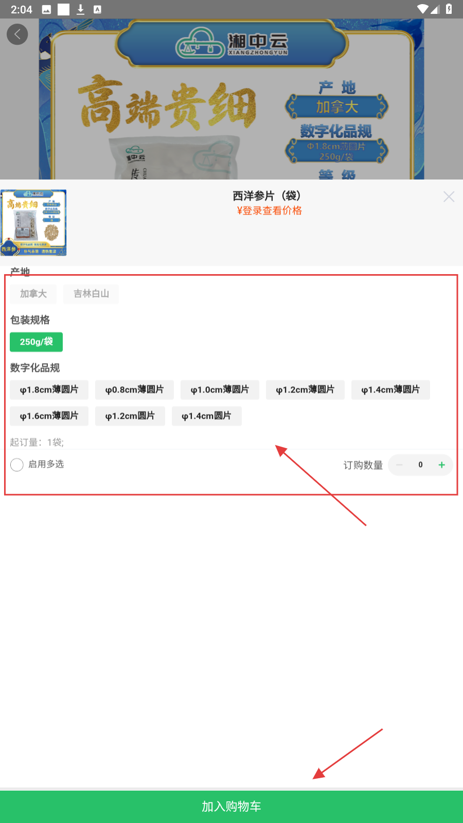 3、商品详情页确认规格(如250g/袋),点【加入购物车】。