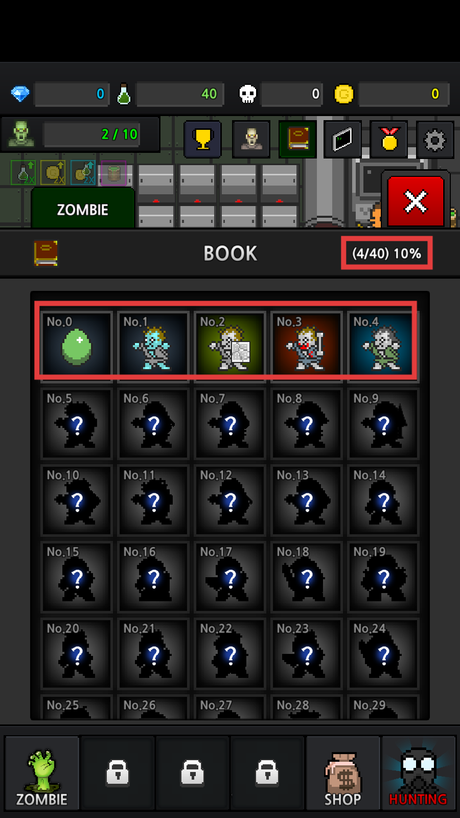 3、查看【僵尸图鉴-(4/40)】,优先解锁已揭示的僵尸,逐步提高图鉴整体完成度。