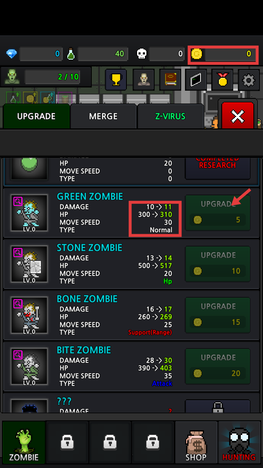 4、消耗金币点击【UPGRADE】升级【GREEN-ZOMBIE】,提升其【HP-300→310】等属性增强战力。