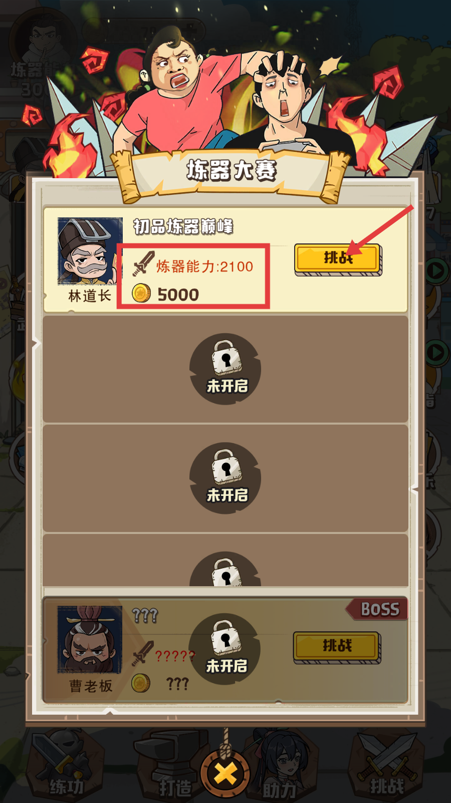 2、进入【炼器大赛】,选择【林道长-炼器能力2100】,花费金币点击【挑战】开启对决。