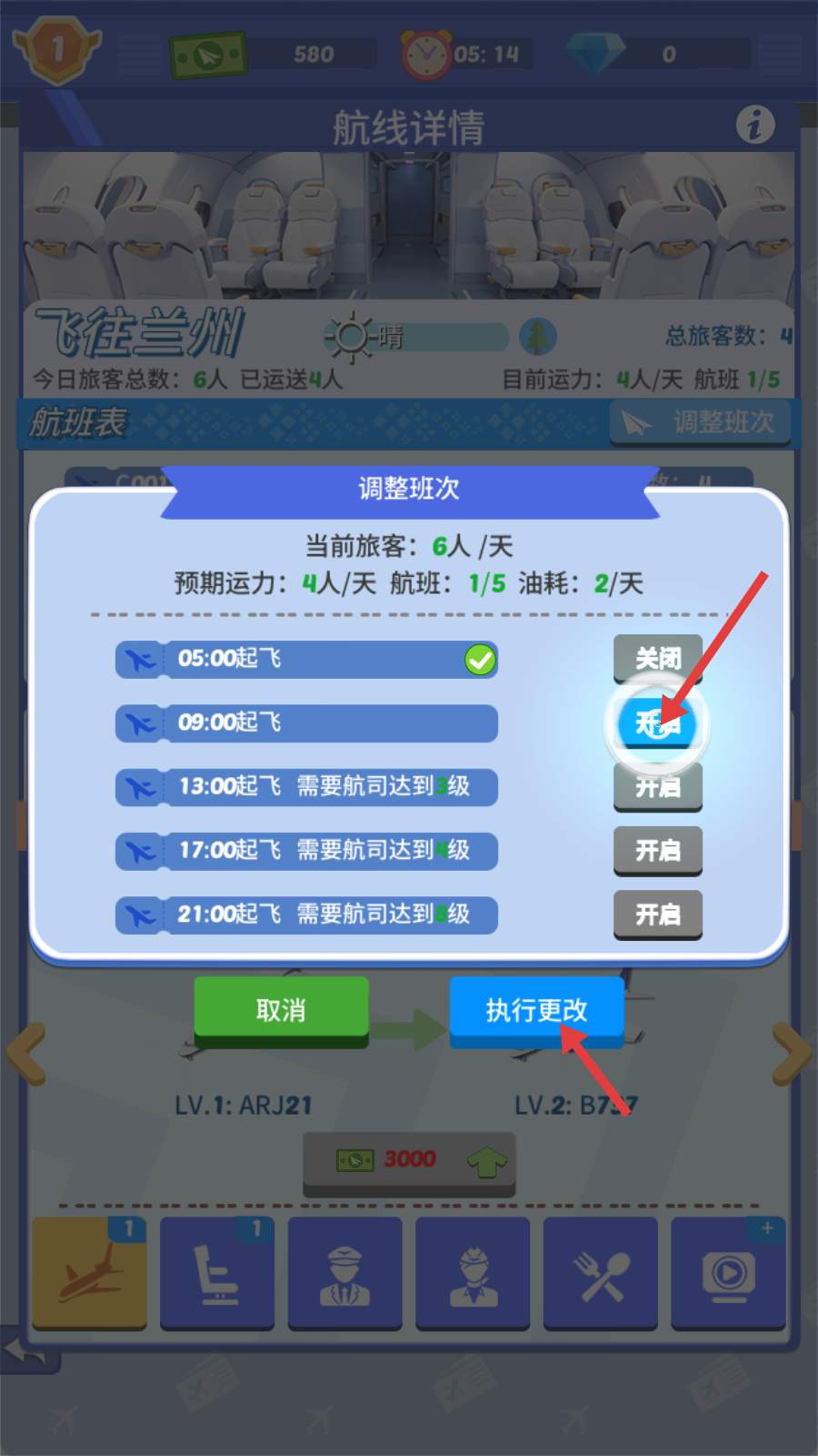 2、在调整班次界面,开启【09:00起飞】班次,点击【执行更改】,提升航线运力与收入。