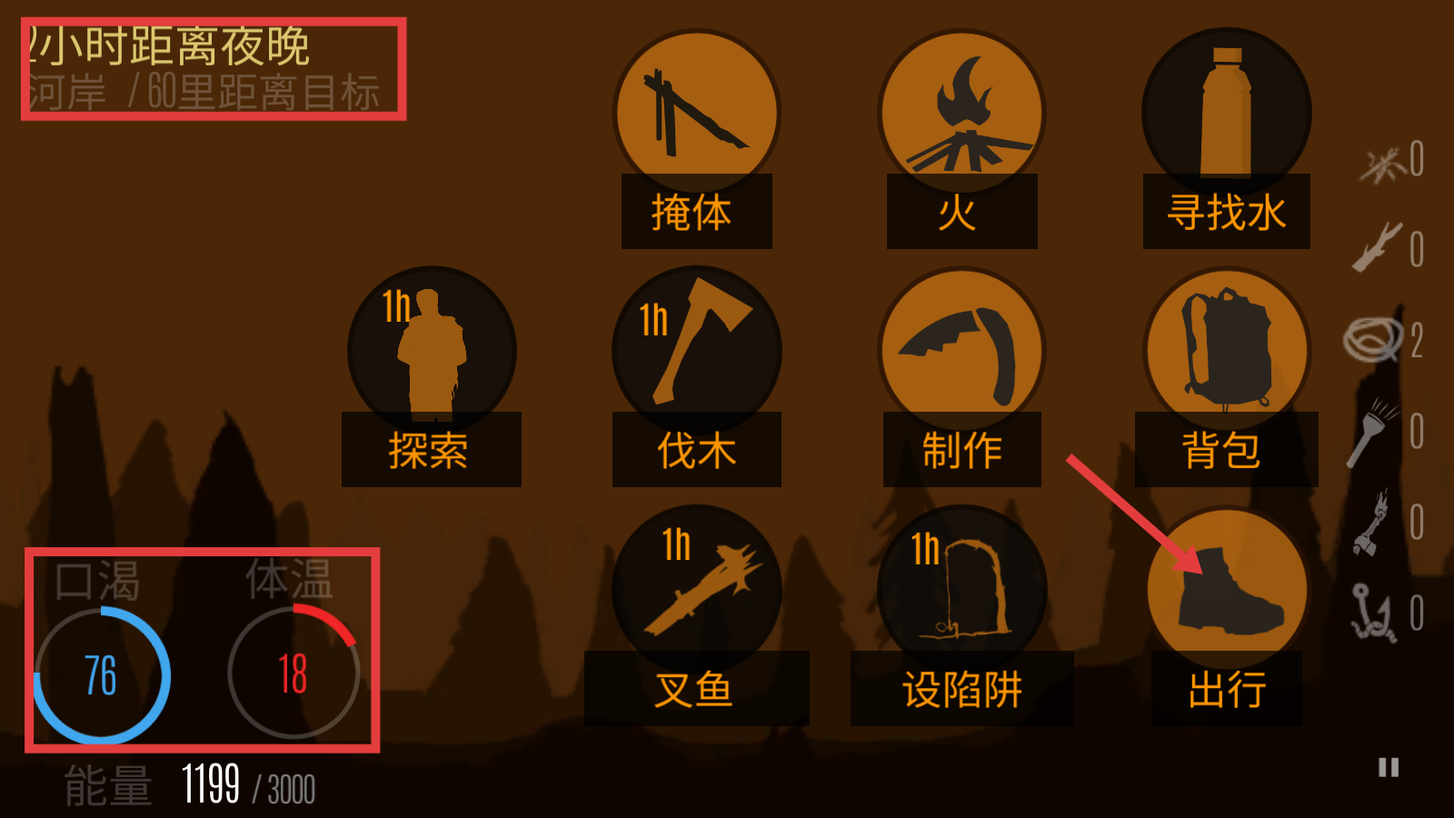 3、关注【小时距离夜晚-河岸/60里距离目标】与【口渴76-体温18】状态,点击【出行】探索。