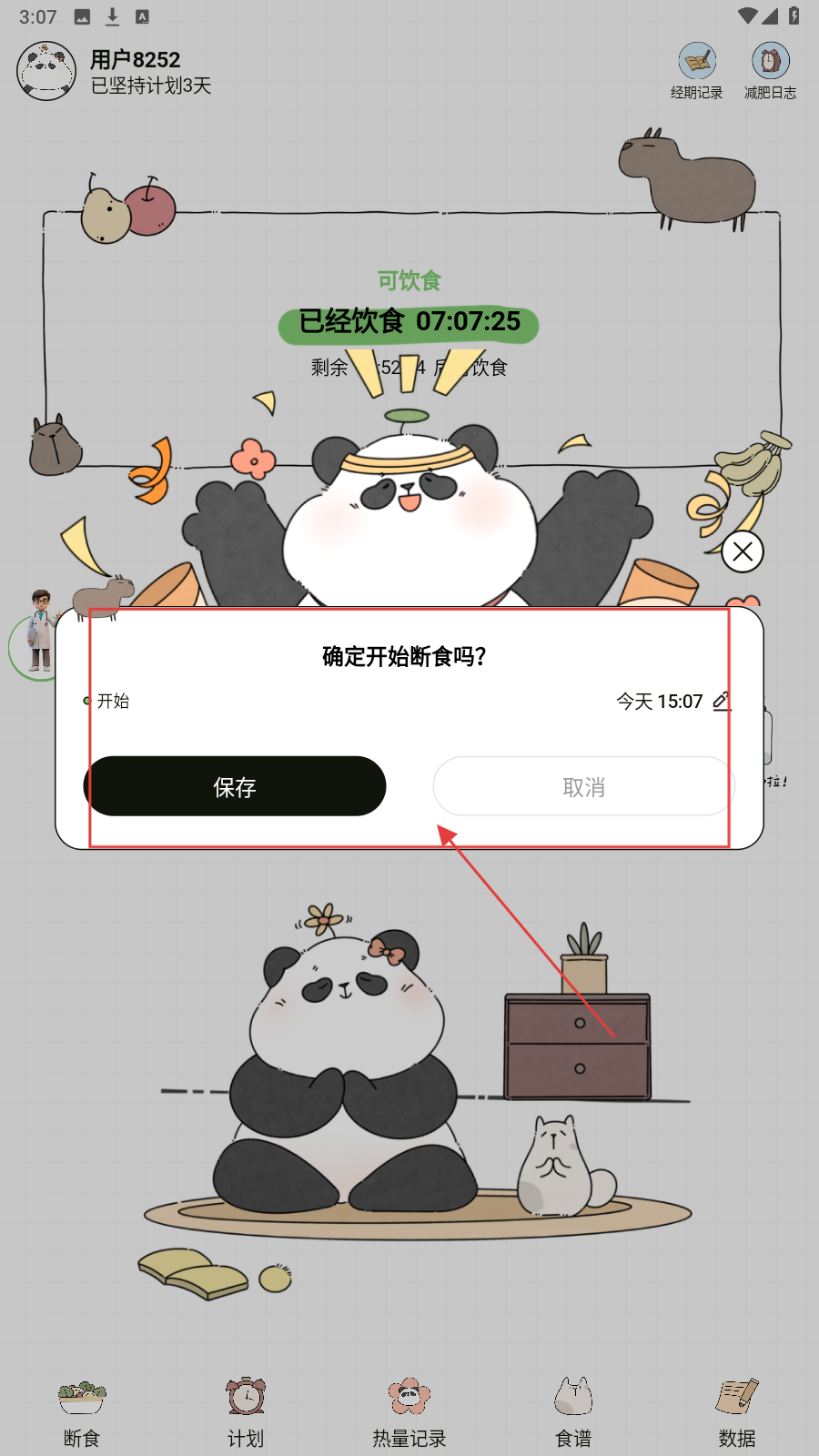 2、弹出确认框,确定开始断食就点【保存】,放弃则选【取消】。