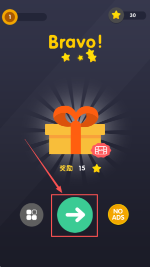 4、完成游戏后领取奖励,点击绿色箭头继续游戏或领取星星奖励。