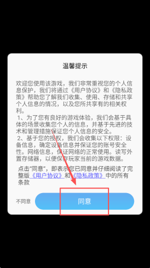 1、阅读并同意游戏的隐私政策,点击“同意”按钮继续。