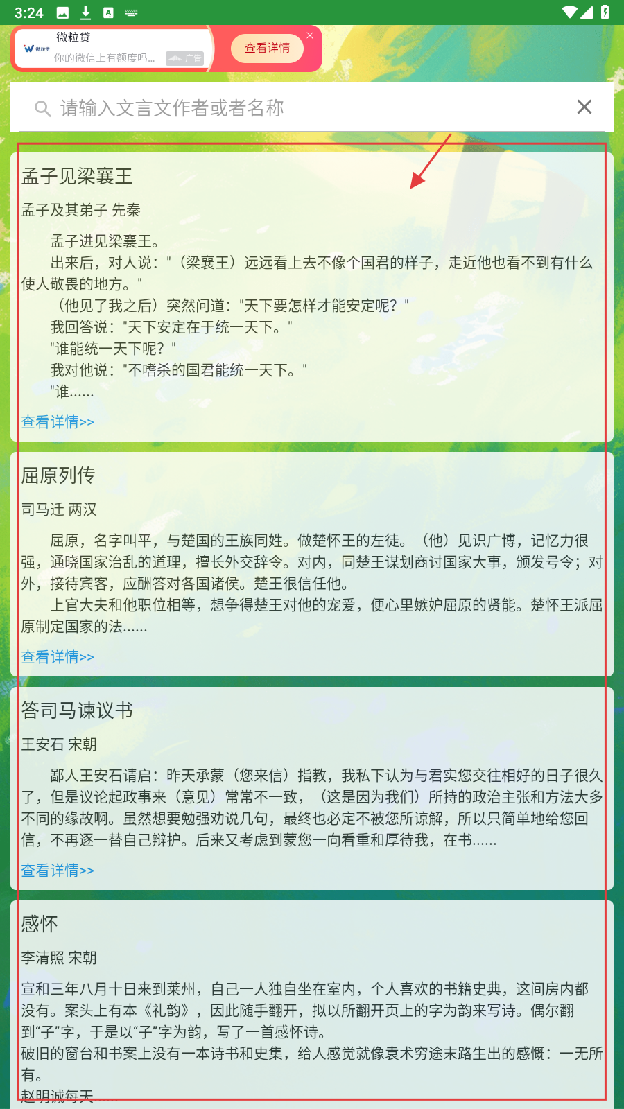 2、在【文言文】页,浏览篇目列表,点感兴趣文章(如《孟子见梁襄王》)读内容。