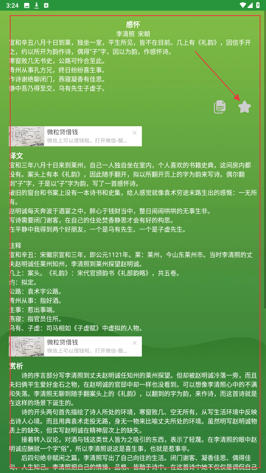 3、打开古诗词(如《感怀》)详情,可收藏(点星星图标),查看译文、注释、赏析学诗词。