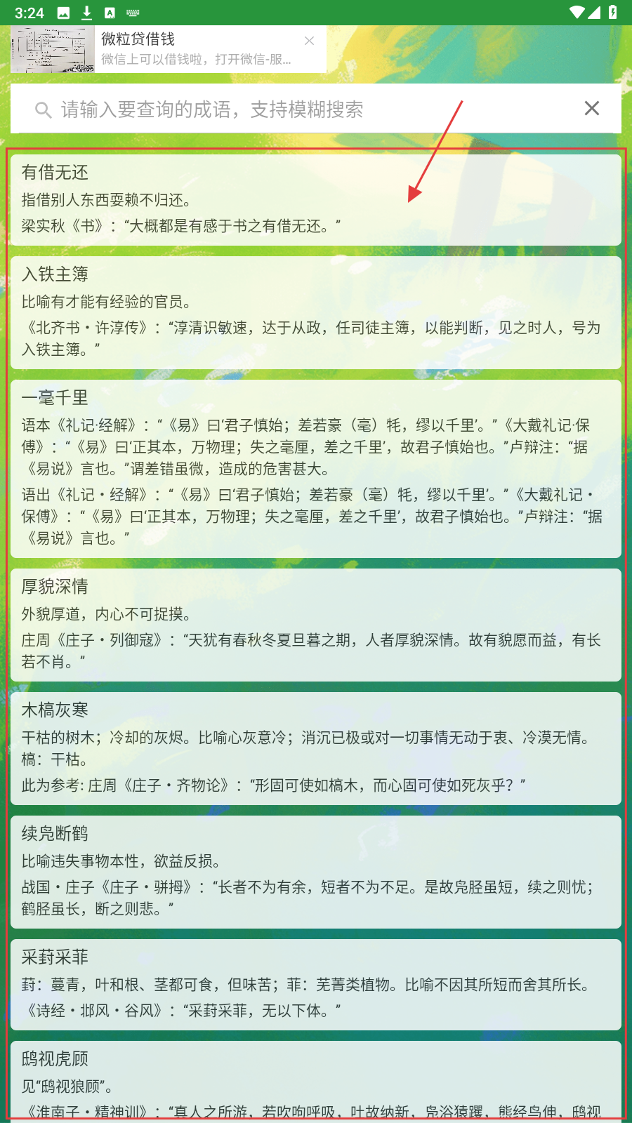 4、到【成语大全】页,搜或浏览成语,点成语看释义、出处,积累成语知识。