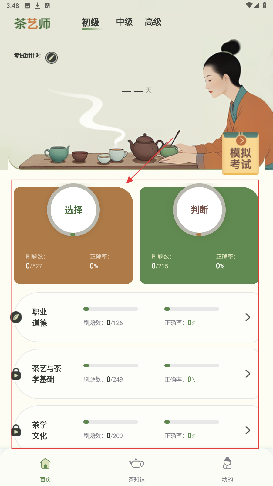 1、进入应用,选初级/中级/高级,通过【选择】【判断】题型刷题,或点模块(职业道德等)学知识。