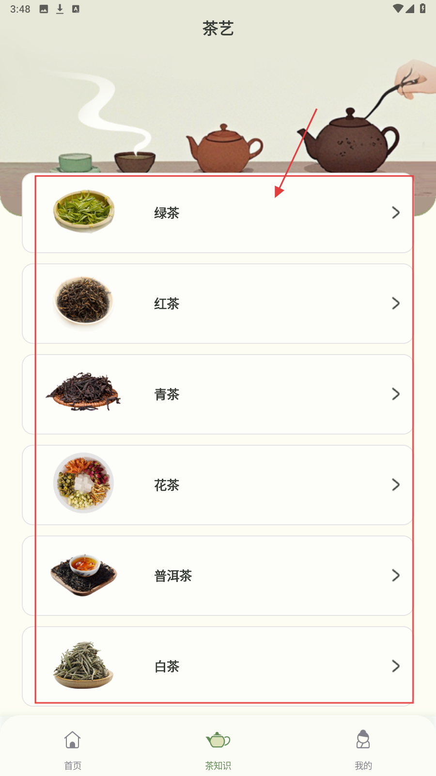 3、到【茶知识】页,选想了解的茶类(如绿茶、红茶),查看详情。