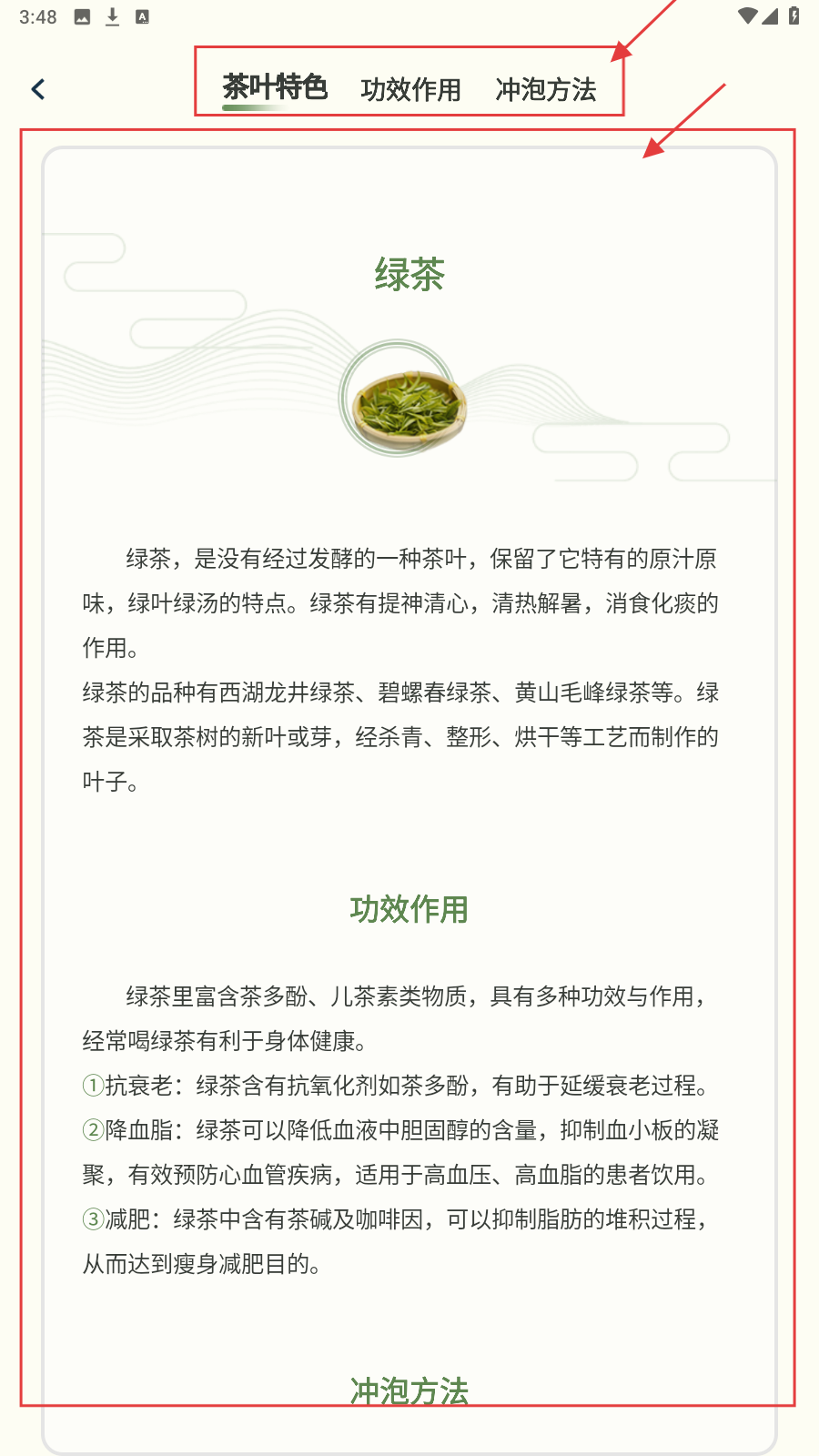 4、在茶类详情页,切换【茶叶特色】【功效作用】【冲泡方法】,全面学该茶知识。