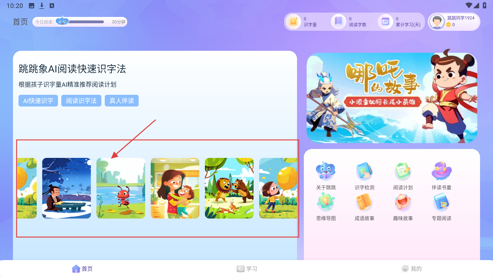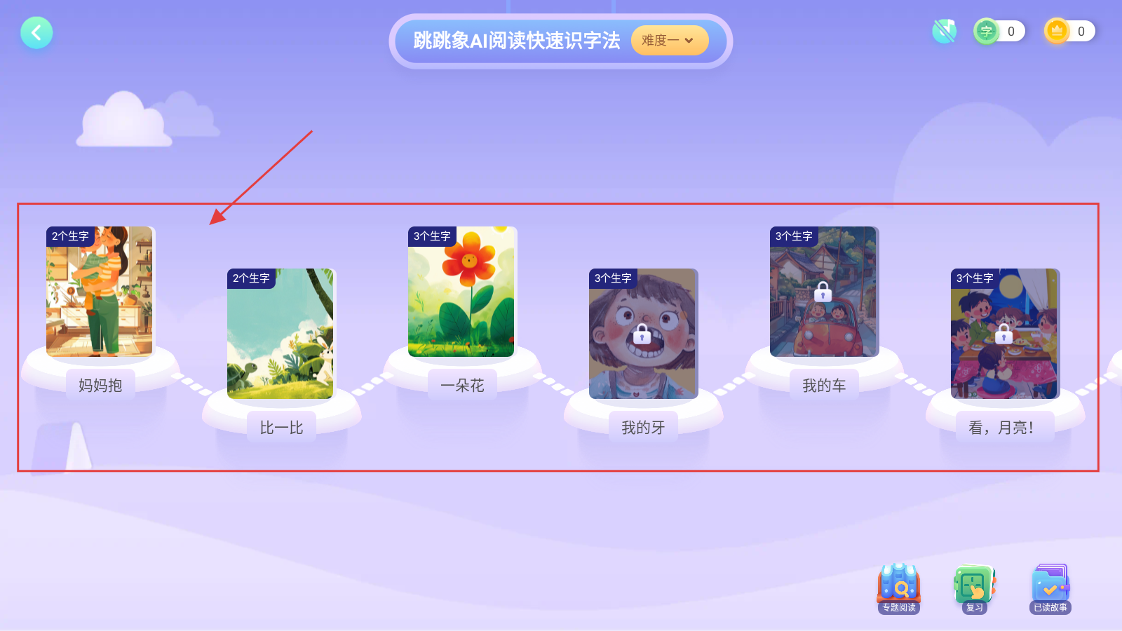 2、在【跳跳象AI阅读快速识字法】里,选难度一绘本,按序学新字,开启识字闯关。