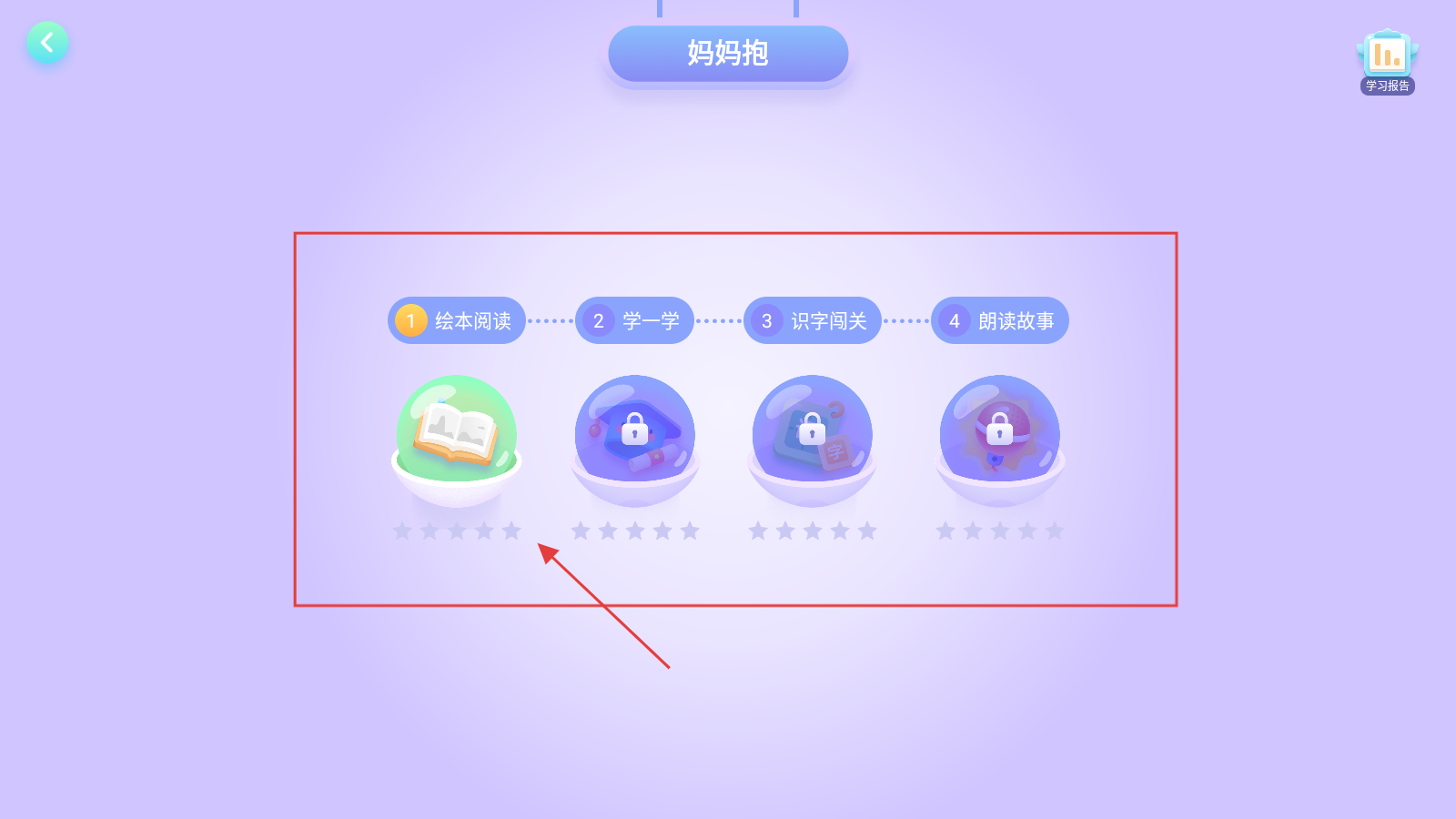3、进入【妈妈抱】绘本页,依次完成阅读、学一学、识字闯关、朗读,解锁学习。