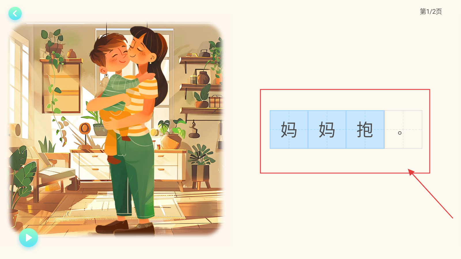 4、读【妈妈抱】绘本,看插画认【妈】【妈】【抱】字,点播放跟读学识字。