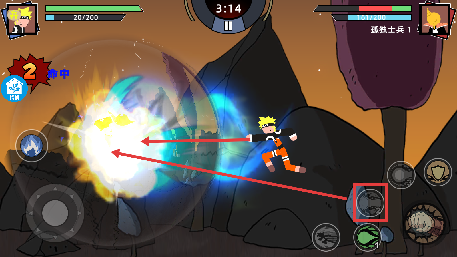 3、点击右侧【技能图标】(如蓝色忍术),对敌人发起攻击,持续消耗其血量。