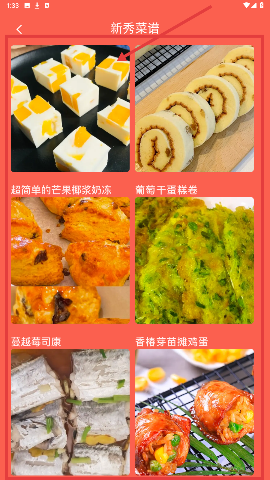 4、切换到【新秀菜谱】页,选新菜品如【超简单的芒果椰浆奶冻】,尝试制作新美食。
