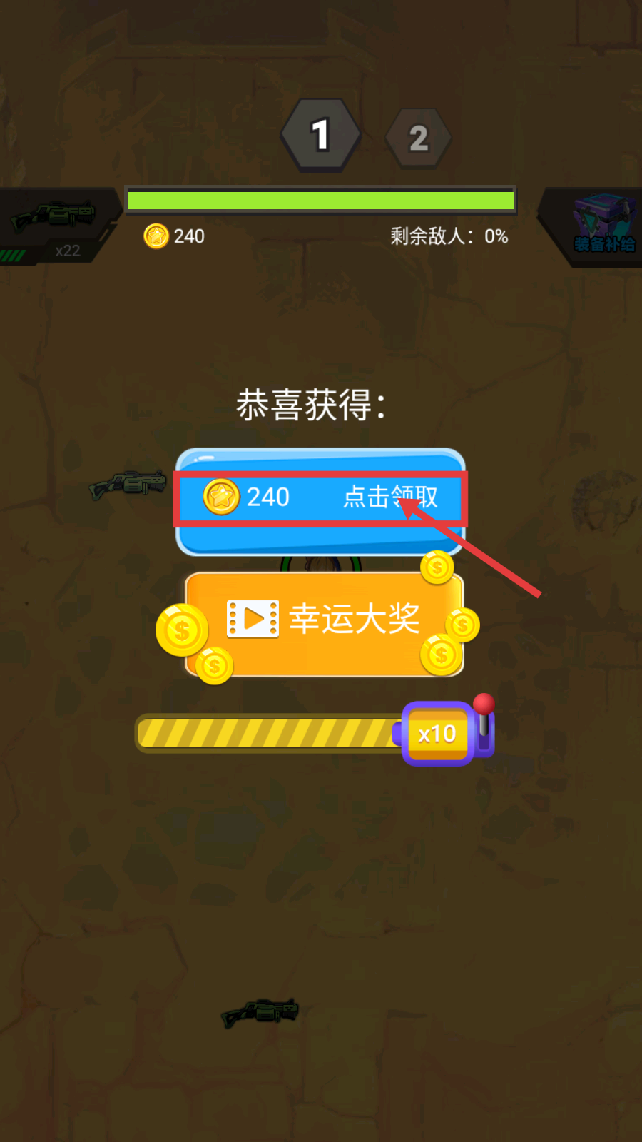 4、关卡结算时,点击【240-点击领取】获取金币,积累资源用于角色养成或装备强化。