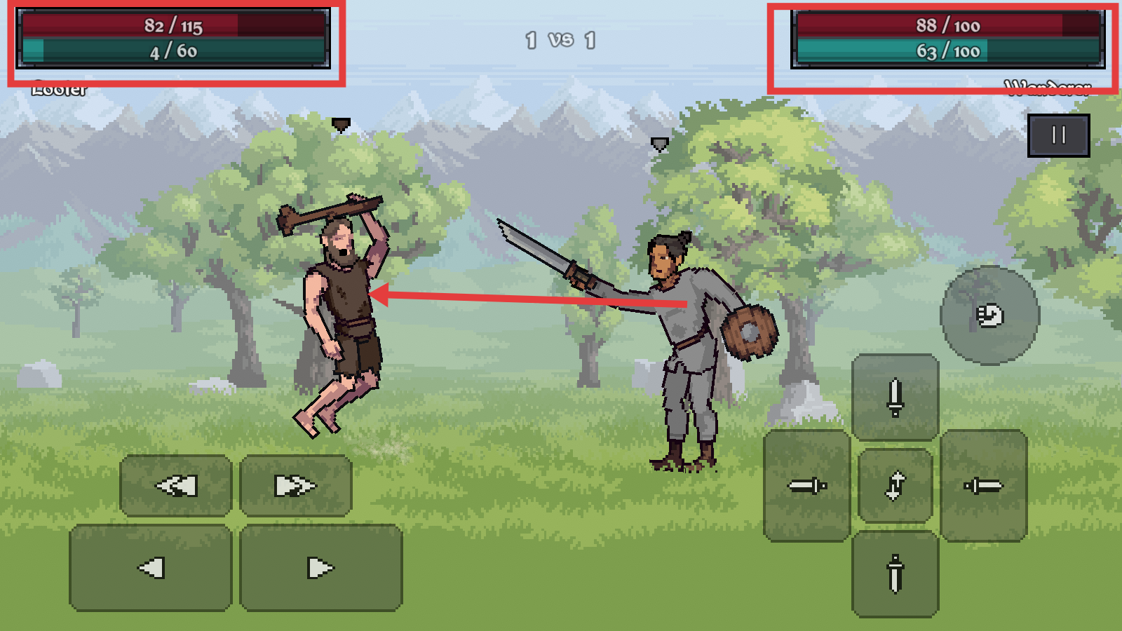 3、保持攻击节奏,消耗敌人血量至濒死,同时关注自身血条(右上角),完成1v1击杀。