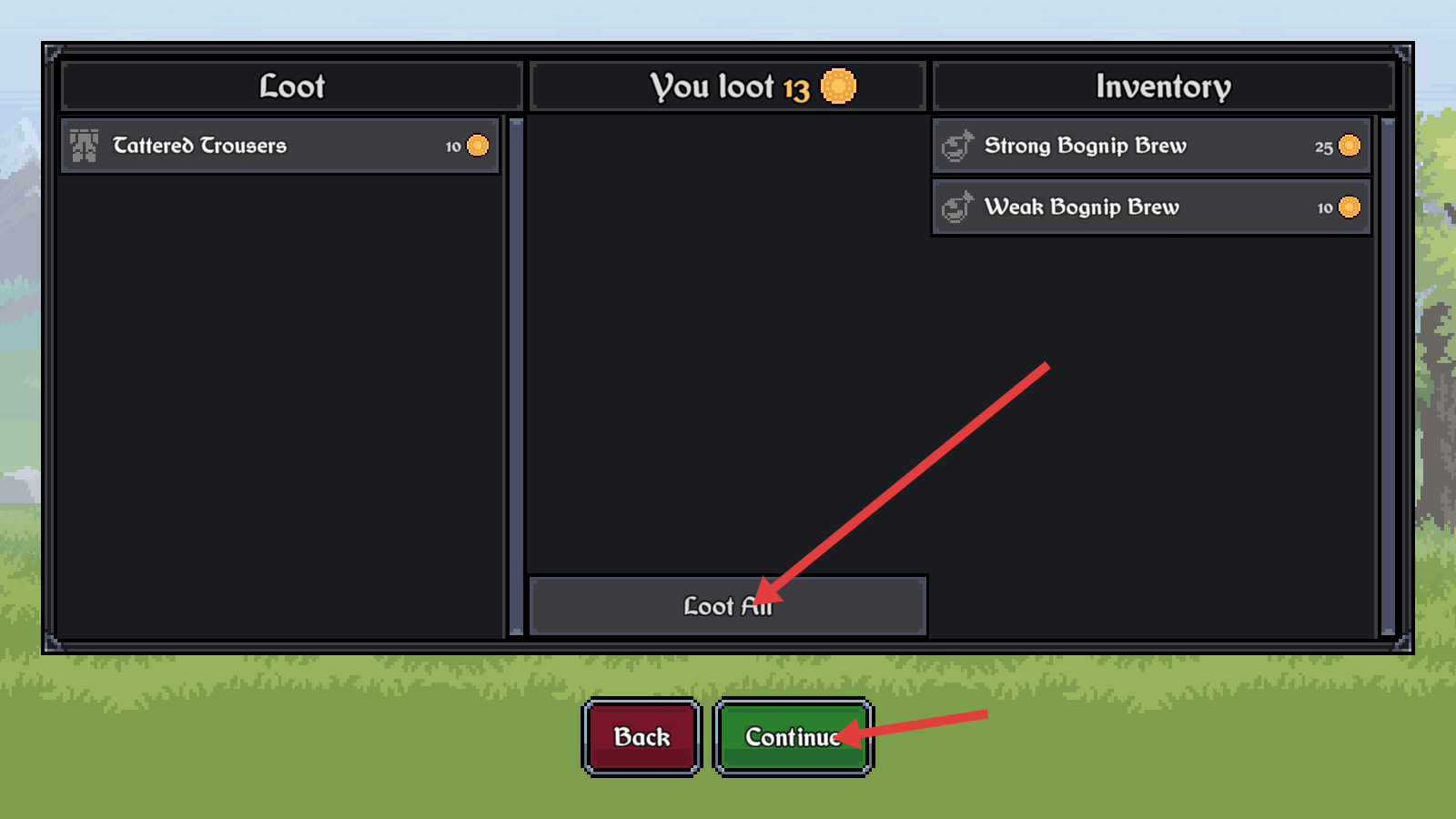 4、胜利后点击【LootAll】拾取装备(如TatteredTrousers)与药水,再选【Continue】继续探索。