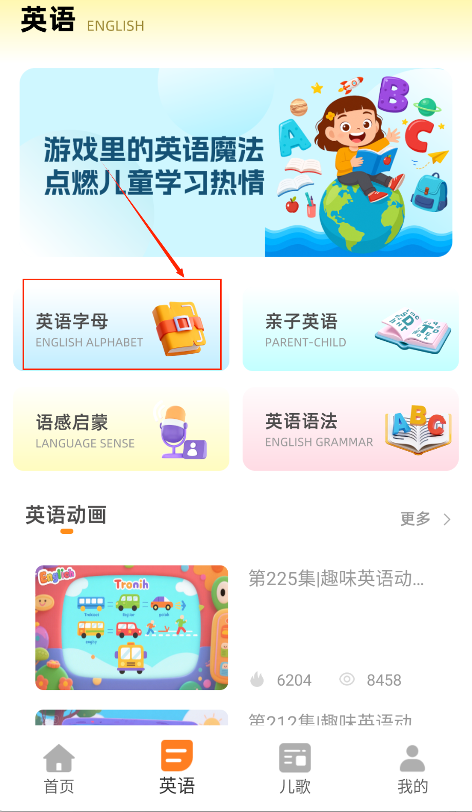 2、进入字母学习板块,通过动画演示认识英文字母形状和发音。互动小游戏帮助巩固记忆,发音评测功能纠正孩子读音。