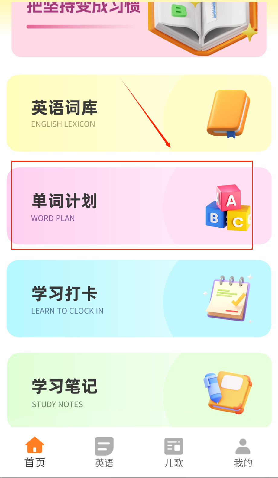 3、在单词计划中设置每日学习目标,完成打卡任务积累学习积分。儿歌和故事板块提供丰富的听力材料,培养语感。