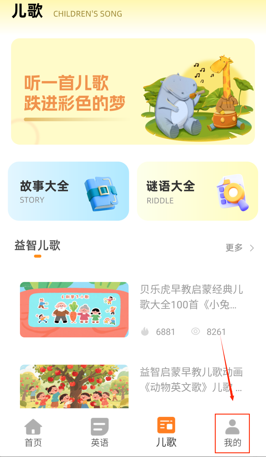 3、儿歌天地收录经典英文童谣,歌词同步高亮显示。跟唱功能录制孩子演唱,与原唱对比改进发音。