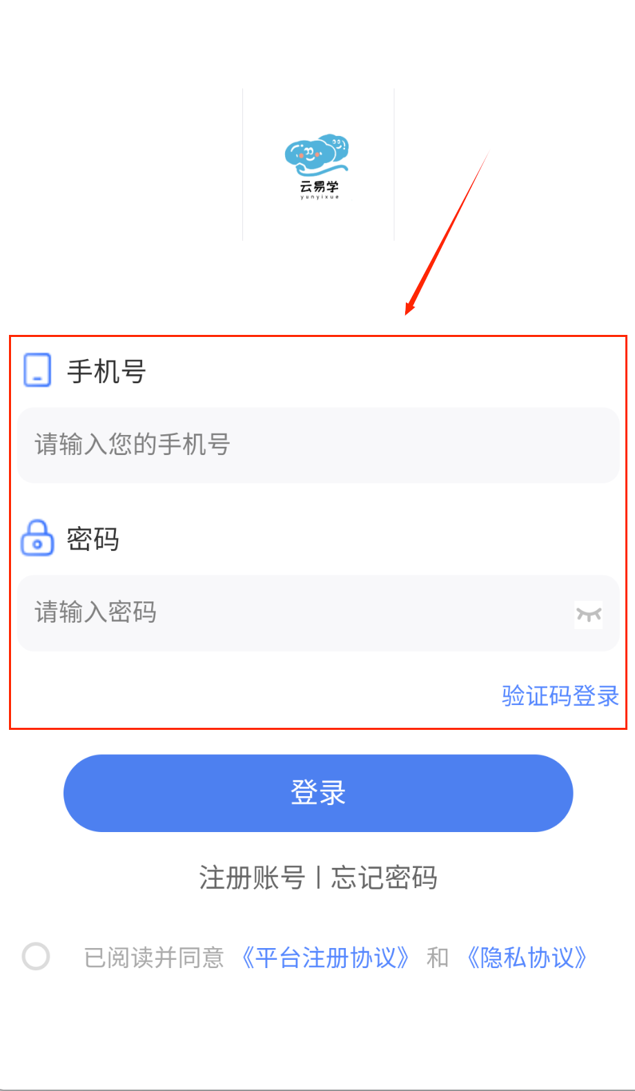 4、登录时可以选择密码登录或验证码登录,看哪个方便用哪个。记得勾选同意协议选项,不然无法完成操作。
