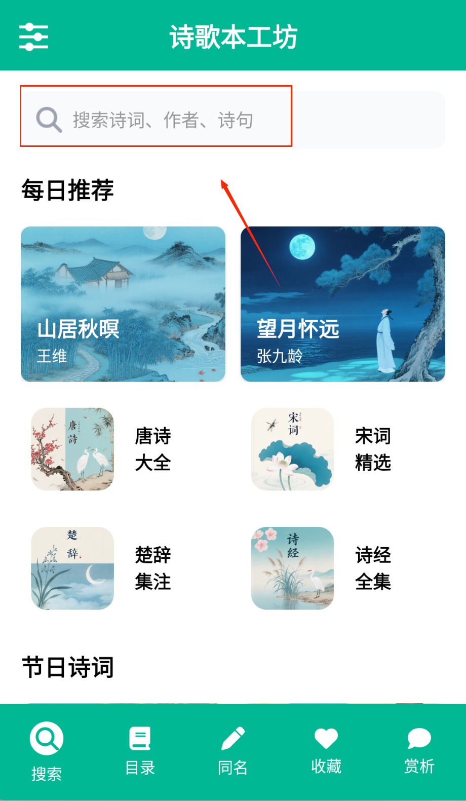 诗歌本工坊包含唐诗、宋词、楚辞、诗经等各类经典作品,支持分类检索和关键词搜索。其特色功能包括诗词赏析、收藏管理、同名诗词查询等,帮助用户深入理解诗词内涵。简洁的界面设计和系统的分类体系,让诗词学习更加便捷高效,这款应用能提供优质的诗词学习体验。