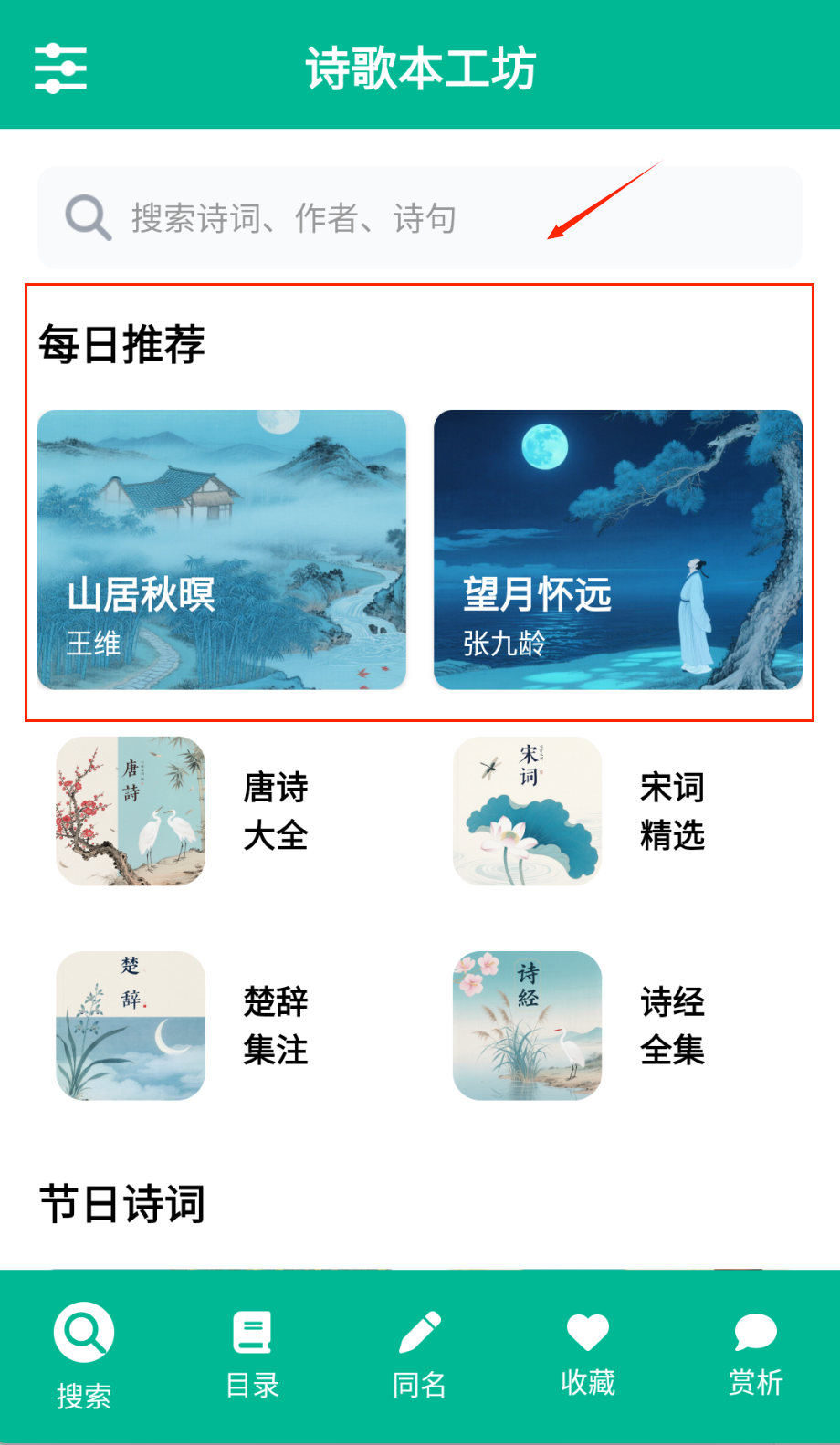 1、下载安装后浏览首页推荐诗词,了解软件基本功能。通过分类导航快速找到感兴趣的诗词类型,如唐诗或宋词。