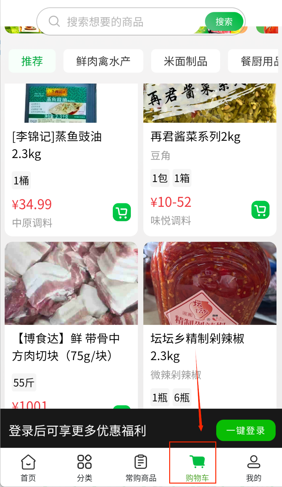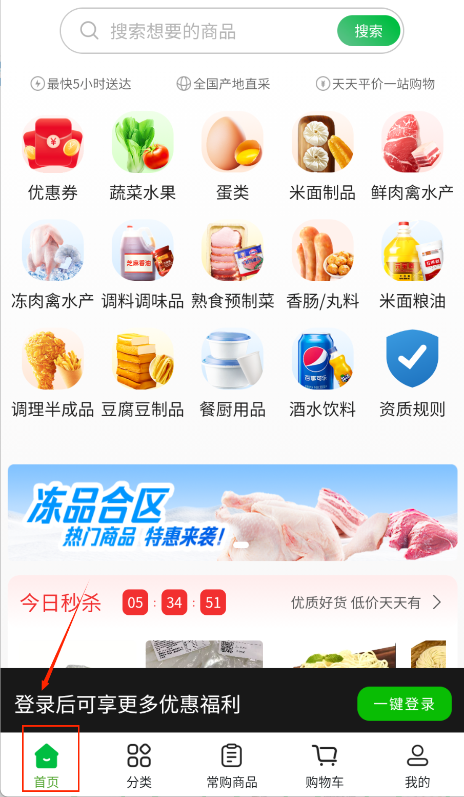 1、下载安装后浏览首页推荐商品,了解限时促销和秒杀活动。通过分类导航或搜索功能快速定位目标食材。