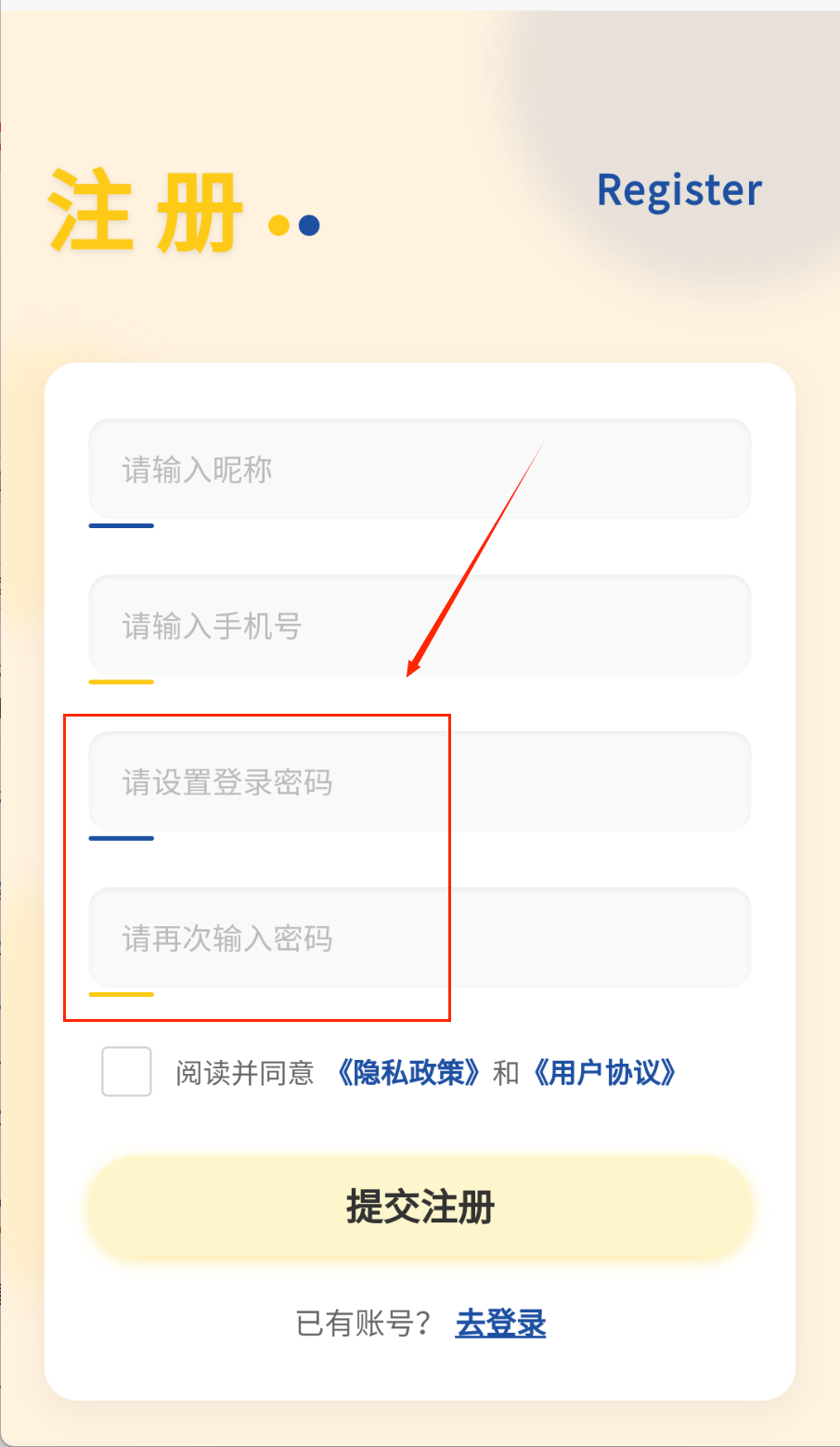 1、打开软件后先看看注册入口呢,点击进入注册页面。按照提示依次填写昵称和手机号,注意别输错了哦。