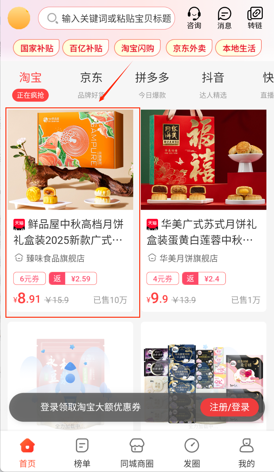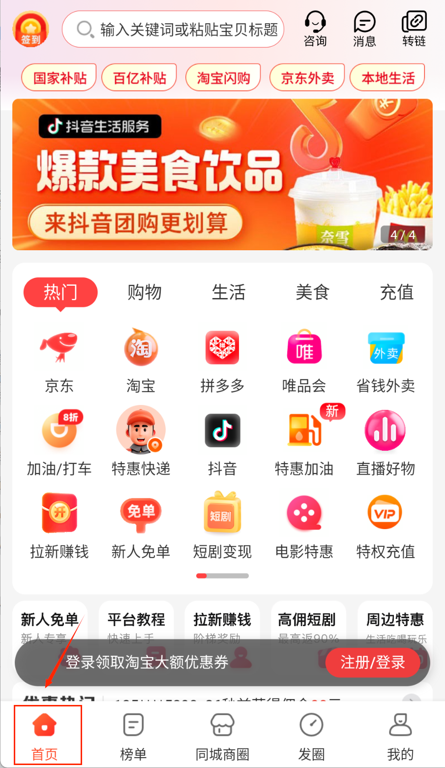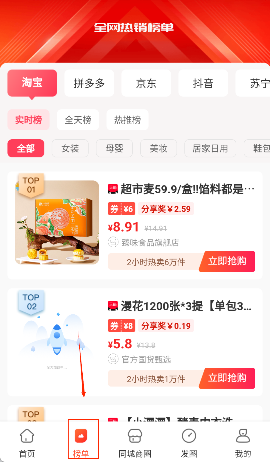 3、在榜单中心查看实时热销商品排行,发现爆款优惠。同城商圈获取外卖、电影等本地生活优惠信息。