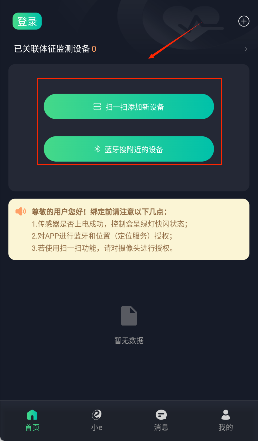 1、下载安装后打开应用,在设备管理页面添加智能监测设备。确保手机蓝牙开启,按照指引完成设备配对连接。