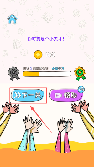 4、完成关卡后,点击“下一关”按钮,继续进行游戏。