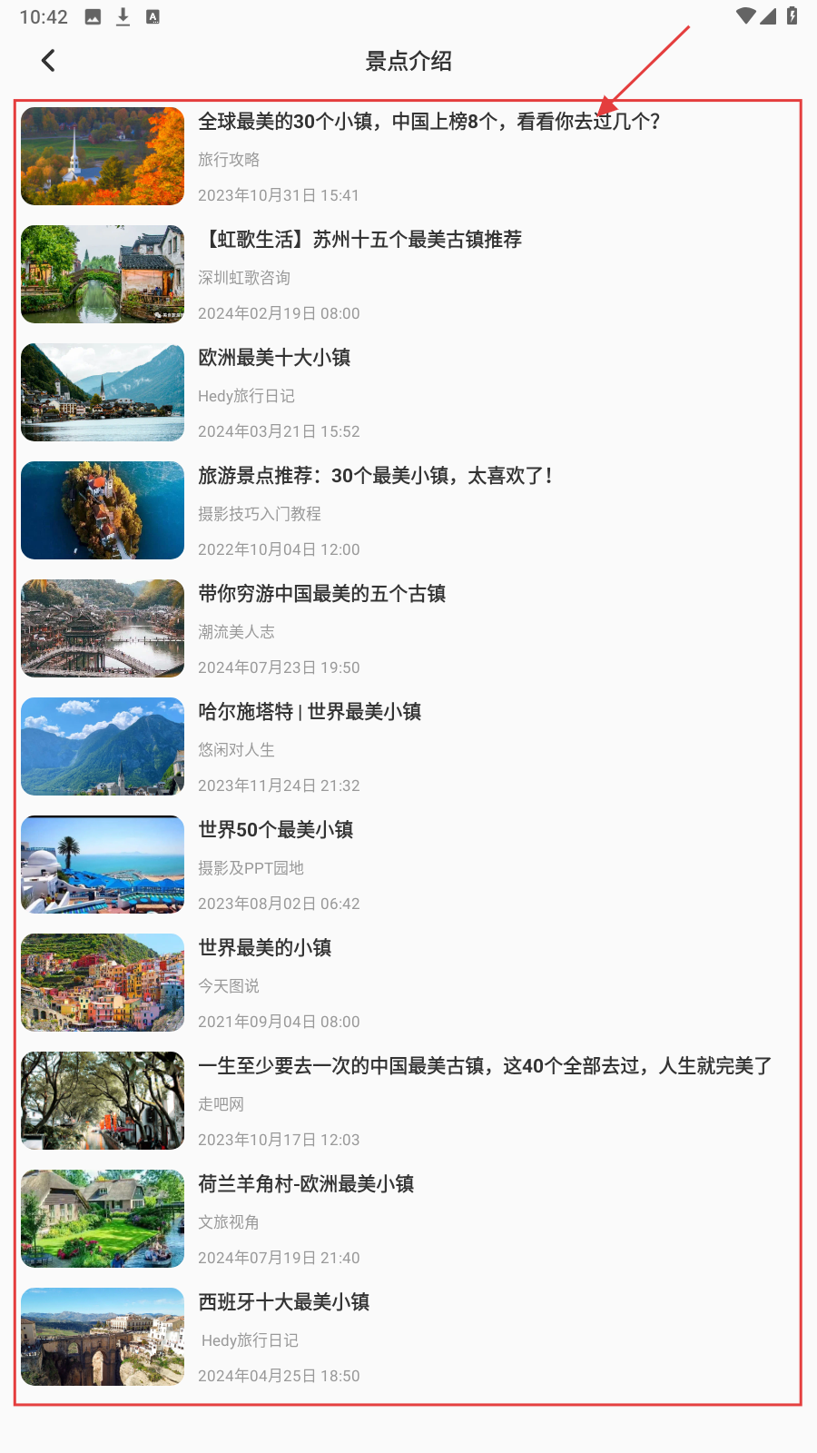 2、选攻略阅读,在景点介绍列表点文章,如《带你穷游中国最美的五个古镇》看详情。
