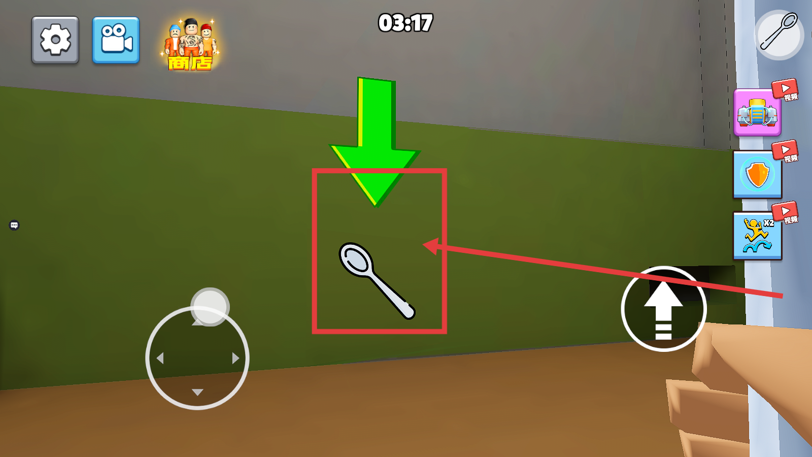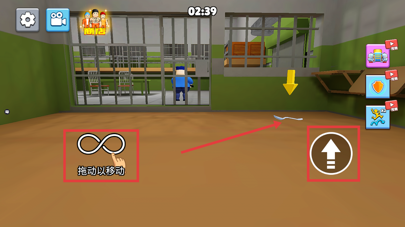 2、左侧拖动摇杆移动-右侧箭头键跳跃,优先拾取地面银色【勺子】(越狱道具)。