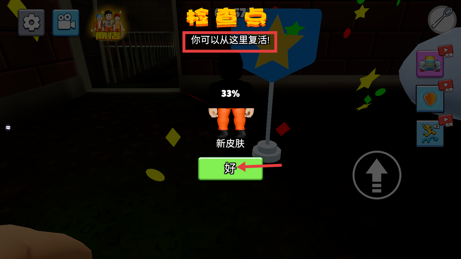 4、抵达检查点-解锁【新皮肤】,点【好】确认,激活复活点继续逃亡。