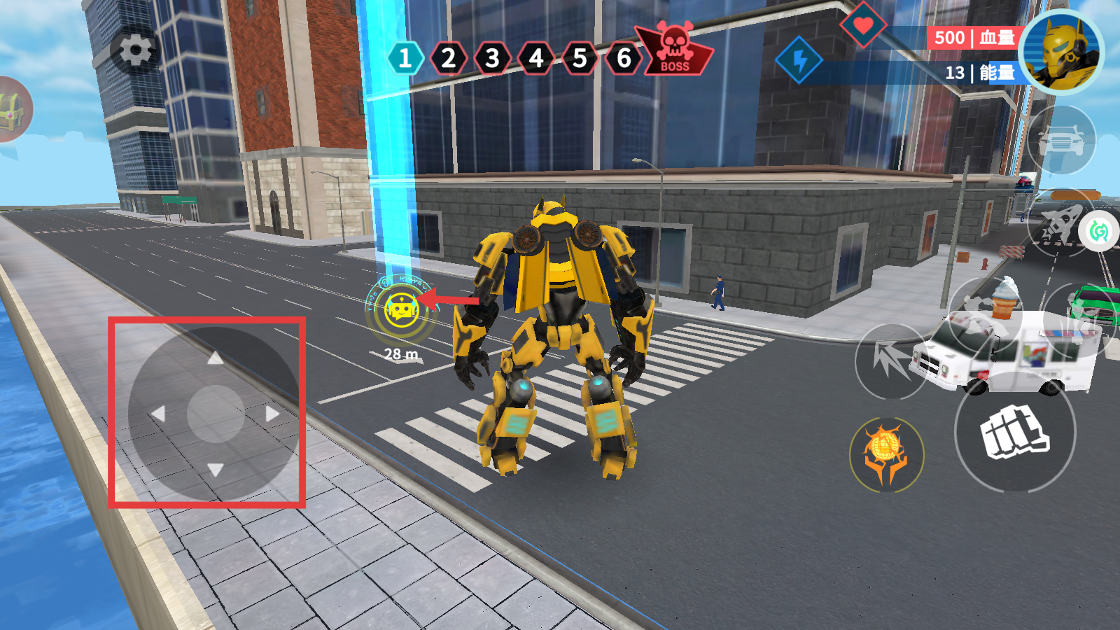 2、通过左下角【虚拟摇杆】控制机甲移动,向【28m-】外任务标识靠近,准备交互。