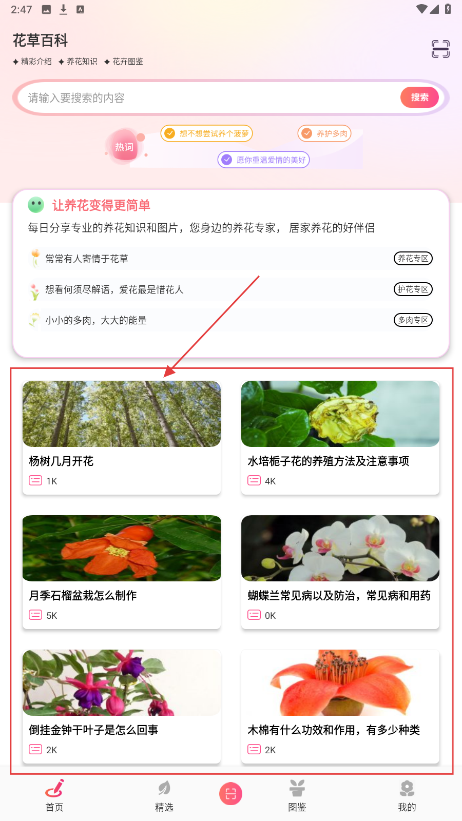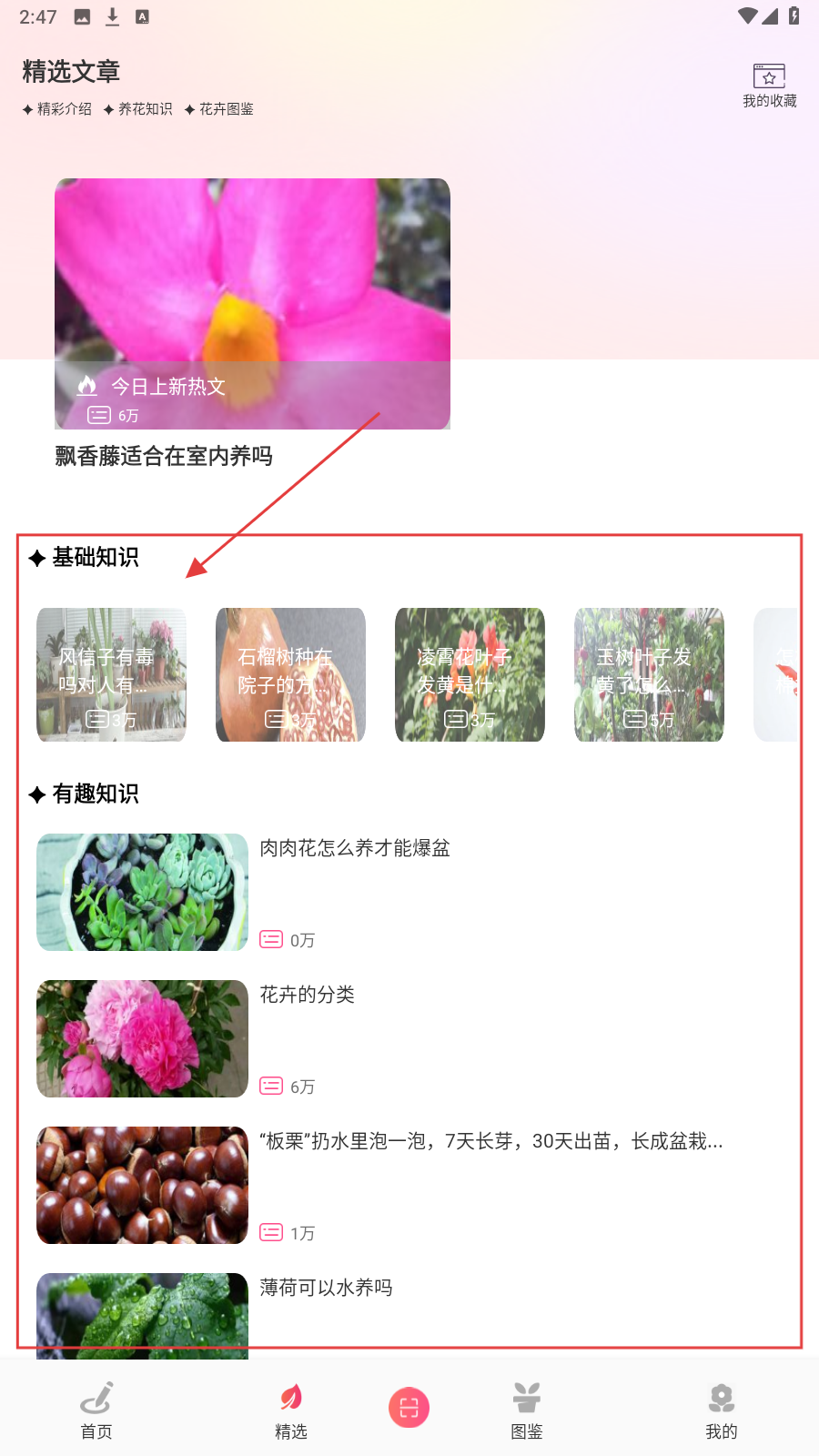 3、切换到【精选】页,选【基础知识】板块文章(如【风信子有毒吗对人有害吗】)阅读。