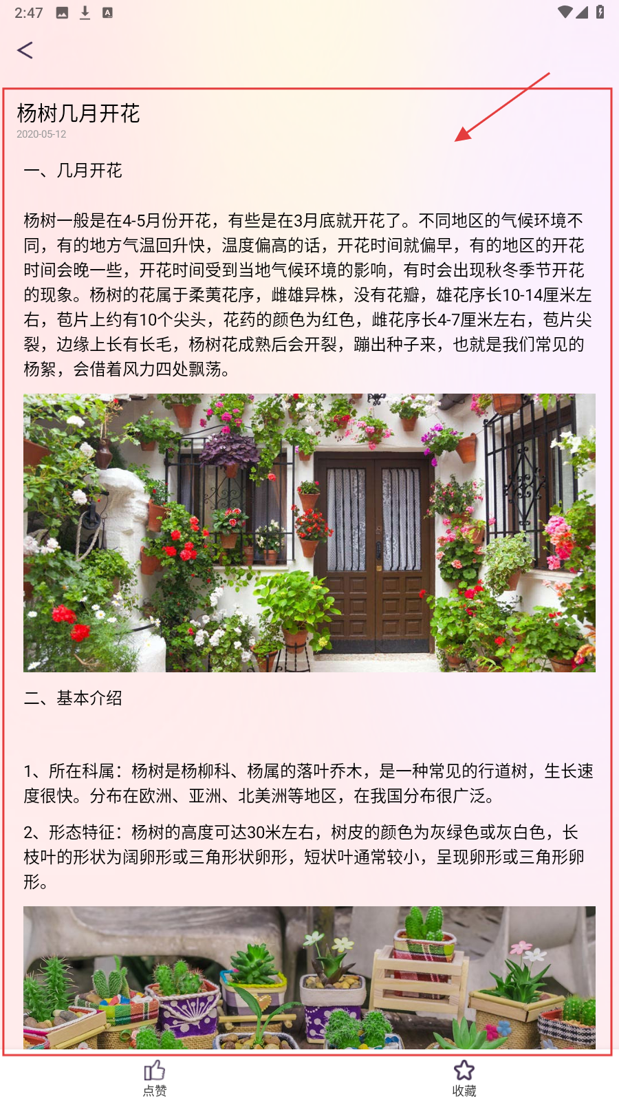 2、浏览文章内容,学习植物知识(杨树花期、科属等),可点赞收藏。